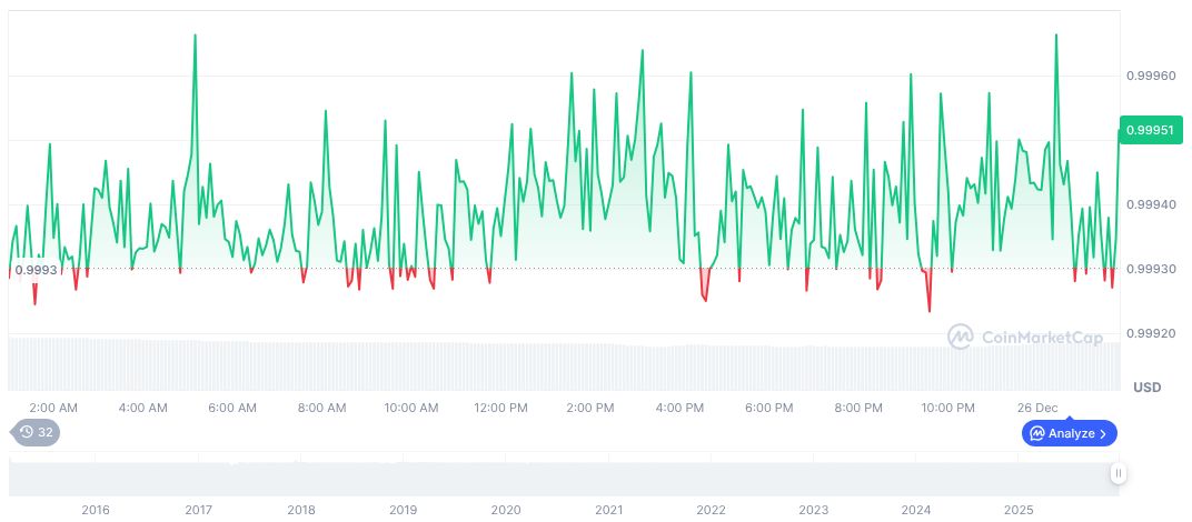According to CoinMarketCap, Tether USDt (USDT) maintains its $1 price point with a market cap of approximately $186.80 billion. It holds a 6.23% market dominance, with notable price changes reflecting a 1.70% increase over 24 hours, and a 2.14% decline over 30 days. Trading volume increased by 22.11%, reaching $68.28 billion.