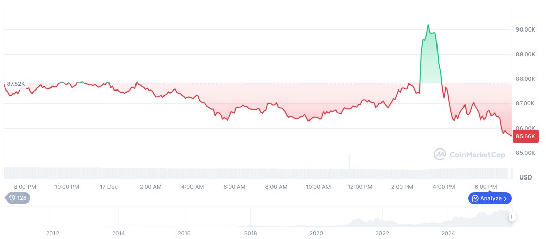 Data from CoinMarketCap shows Bitcoin (BTC) recently trading at $86,774.77, reflecting a decline of 3.83% over the past week and 3.30% over the last month. With a circulating supply of 19,963,612, Bitcoin’s market dominance stands at 59.50%. The cryptocurrency’s market cap is valued at $1.74 trillion.