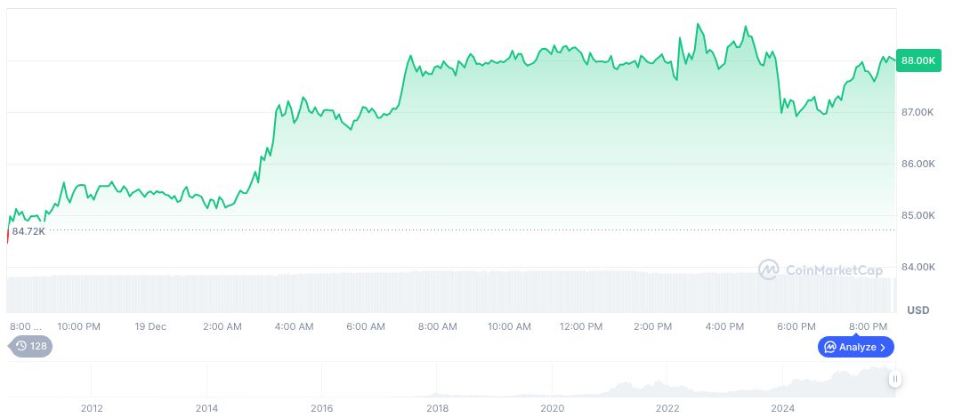 Bitcoin’s current price stands at $88,059.02, supported by a market cap of 1.76 trillion. The 24-hour trading volume experienced a 13.48% decrease, reaching 45.61 billion. Over 30 days, price movement declined by 4.54%, demonstrating volatility typical of current cryptocurrency and blockchain markets, as per CoinMarketCap‘s data.