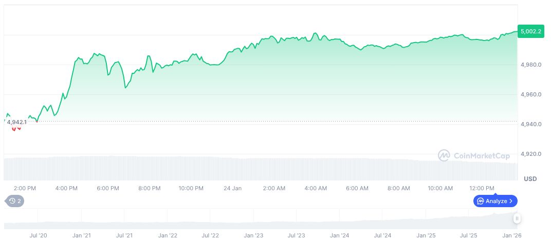 A well-known cryptocurrency whale acquired 3,983.6 XAUt tokens for $20.23 million on January 25, 2026, following on-chain analyst Yu Jin’s recent gold price monitoring.