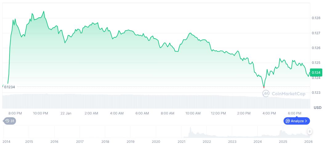 As of January 22, 2026, Dogecoin (DOGE) trades at $0.12 with a market cap of $20.93 billion, holding a market dominance of 0.70%. The 24-hour trading volume stands at $1.07 billion. CoinMarketCap reports its 90-day price has decreased by 36.72%.