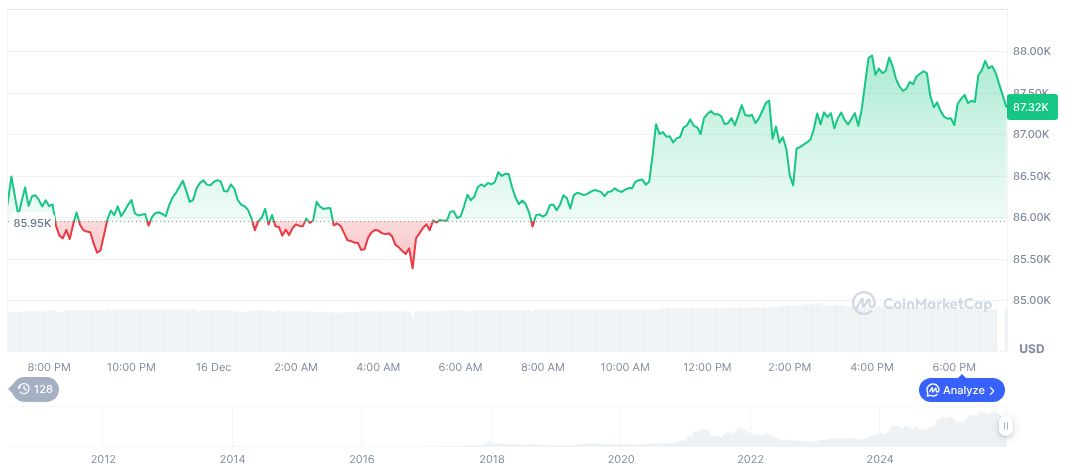 Bitcoin (BTC) currently trades at $87,028.45 with a market cap of $1.74 trillion, per CoinMarketCap data. BTC’s 90-day decline sits at 25.84%, while its dominance is 58.80%. Recent price movements showcase a 0.10% decline in 24 hours with trading volume dropping 24.41% to $36.70 billion. BTC’s supply approaches its maximum limit, maintaining interest levels amidst developing market factors.