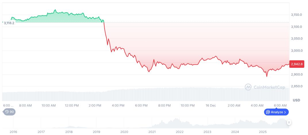 Ethereum (ETH), as reported by CoinMarketCap, trades at $2,934.94 with a market cap of $354.23 billion, reflecting a 24-hour decline of 3.55%. The trading volume stands at $28.79 billion, showing a 28.59% increase. Over 90 days, ETH exhibited a notable 34.69% decrease.