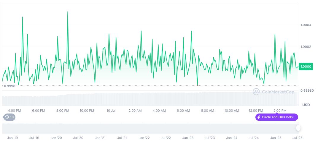 According to CoinMarketCap, USDC’s valuation remains stable at $1.00 with a circulating supply of approximately 62.80 billion units. Its market cap is around $62.79 billion, and the USDC faces consistent trading volumes, maintaining around 1.78% market dominance.