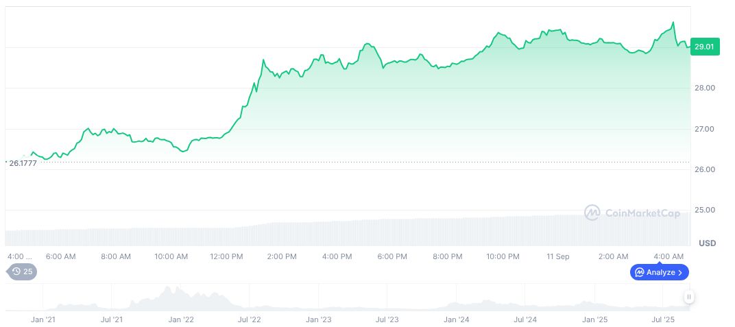 According to CoinMarketCap, Avalanche (AVAX) is currently priced at $28.88 with a market cap of $12.19 billion, representing 0.31% of the market. AVAX saw price increases of 0.55% over 24 hours, 18.20% over 7 days, and 16.37% over 30 days, with the fully diluted market cap reaching $20.67 billion.