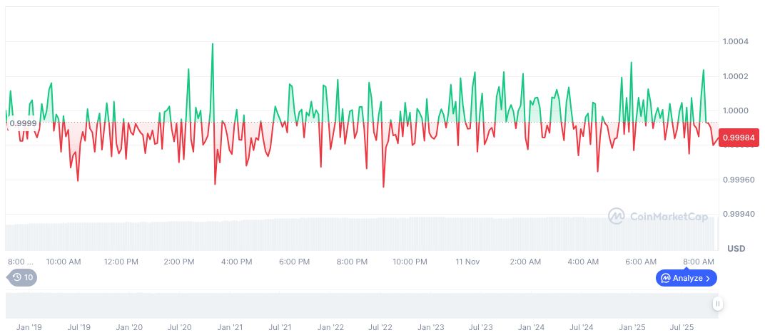 USDC maintains its value at $1.00 with a market cap of $76.08 billion and dominates 2.18% of the market. Trading volume has increased by 10.24% over the past 24 hours, with minor fluctuations observed over 7 to 90 days, according to CoinMarketCap data.