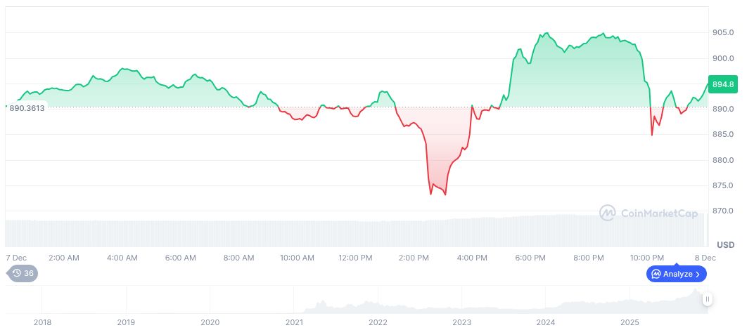 BNB, currently priced at $894.29, holds a market cap of $123.18 billion with a 24-hour trading volume standing at $1.77 billion. Market dominance is 4.02%, reflecting BNB’s central role in today’s market dynamics. Recent price assessments from CoinMarketCap show slight volatility, with a 24-hour increase of 0.41%, indicating stability despite broader market fluctuations.