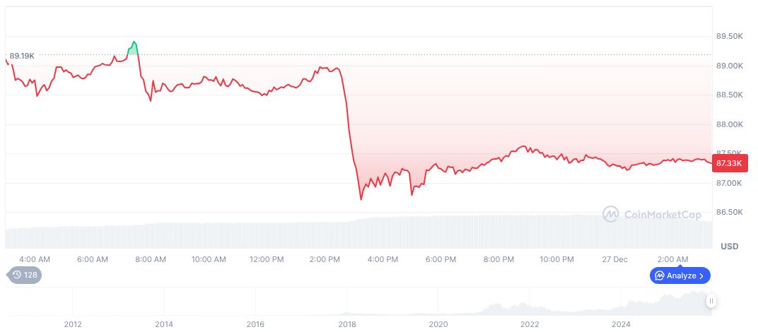 According to CoinMarketCap, Bitcoin currently prices at $87,435.92 with a market cap of $1.75 trillion. It dominates 59.13% of the market despite a 1.60% price drop in the last 24 hours. Over the past 90 days, Bitcoin has decreased by 20.07%.