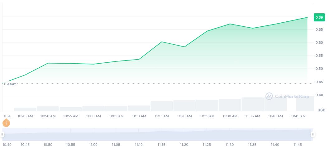 Holoworld AI (HOLO) currently trades at $0.65 with a market cap of $224.86 million and a 24-hour trading volume of $60.91 million, according to CoinMarketCap. The token has exhibited a 28.75% price increase over several time frames. The day’s high activity may drive further market interest.