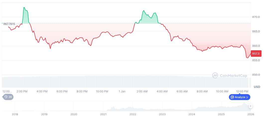 According to CoinMarketCap, BNB is trading at $857 with a market cap of $118 billion, maintaining a market dominance of 3.97%. The 24-hour trading volume is approximately $2.14 billion, reflecting a 7.20% decrease. In 90 days, the price declined by 22.64%.