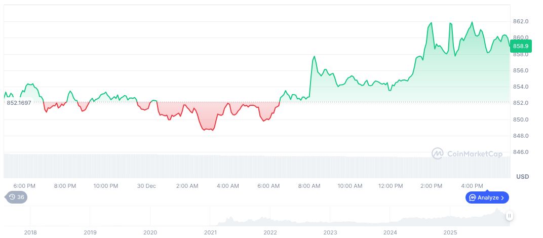 BNB, with a current price of $859.32 and a market cap of $118.35 billion, represents 3.96% of the market, per CoinMarketCap. Despite a 10.11% drop in 24-hour trading volume, BNB prices rose by 0.78% in the same period. Over the last 60 days, however, BNB saw a decline of over 20%.