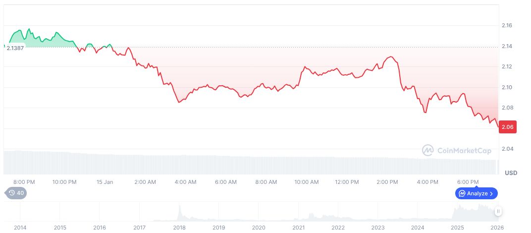 On January 15, 2026, XRP traded at $2.07 with a market cap of $125.38 billion, holding a market dominance of 3.88%. Recent price movements show a 3.92% decline in the past 24 hours. Trading volume fell 37.62% to $3.15 billion. Data from CoinMarketCap reveals a 90-day loss of 10.32% and a current circulating supply of 60.70 billion XRP.