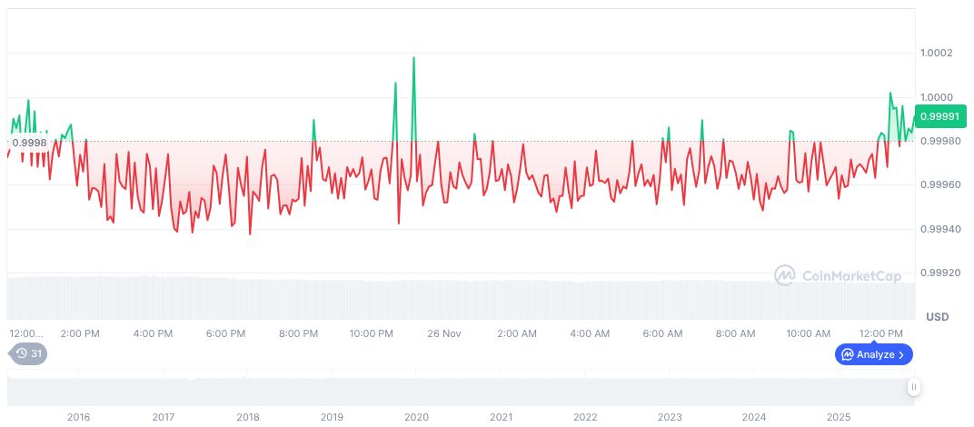 According to CoinMarketCap, Tether USDt (USDT) is currently priced at $1.00 with a market cap of $184.50 billion. Its 24-hour trading volume dropped by 13.06%, reflecting variances in cryptocurrency market activity. USDT maintains a 6.19% market dominance.