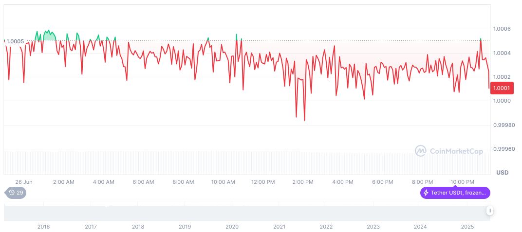 According to CoinMarketCap, Tether (USDT) maintains a stable price of $1.00, with a market cap of formatNumber(157511308871, 2) and circulating supply of formatNumber(157480181405, 2). The 24-hour trading volume shows a -12.26% change, indicating ongoing USDT activity.