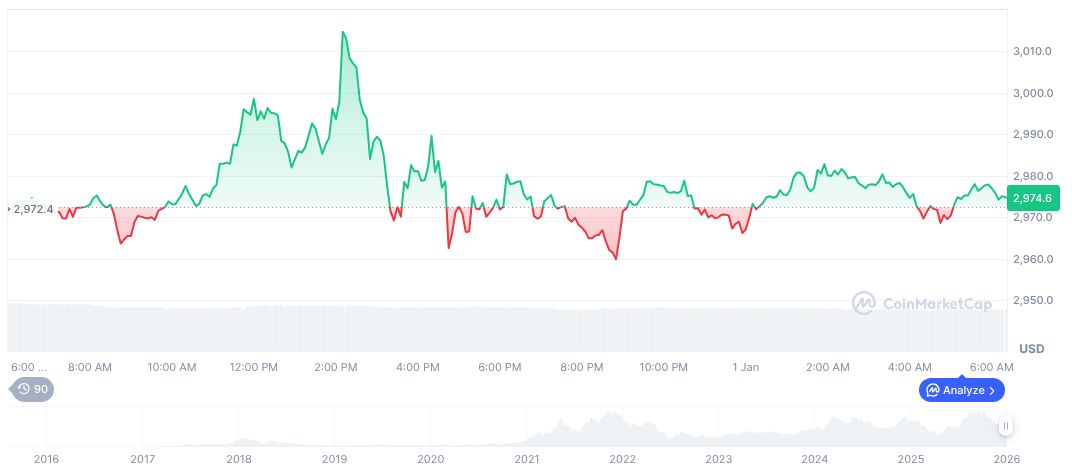 Ethereum (ETH) currently trades at $2,980.35 with a market cap of $359.71 billion, experiencing a 0.25% increase in the past 24 hours. Its dominance stands at 12.11%, with a 24-hour trading volume of $15.63 billion, according to CoinMarketCap data updated on January 1, 2026.