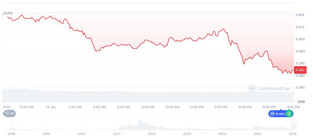 Cardano (ADA), trading at $0.39, has a market capitalization of $14.10 billion. CoinMarketCap reports a notable 24-hour volume decrease of 23.01%. Recent trends indicate a 5.72% drop over 24 hours and a gradual 1.26% increase over 30 days, pointing to fluctuating market confidence.
