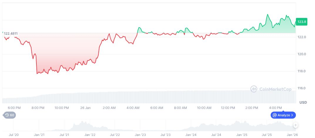 As of January 26, 2026, Solana (SOL) is priced at $123.50 with a market cap of $69.90 billion, indicating a 1.13% price rise in 24 hours. Despite a 134.54% increase in trading volume, Solana’s 60- and 90-day performance shows negative trends at -13.01% and -38.37%, respectively. Data sourced from CoinMarketCap illuminates SOL’s fluctuating performance in recent months.