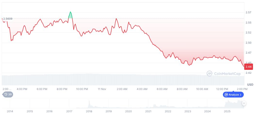 According to CoinMarketCap, XRP is currently valued at $2.44, with a market capitalization of $146.78 billion. Its trading volume in the last 24 hours stands at $5.29 billion, a dip of 6.94%. In recent months, XRP has exhibited varied price changes, peaking at an 8.30% increase within the last seven days, but revealing a long-term downward trend over the previous 90 days with a reduction of 25.74%.