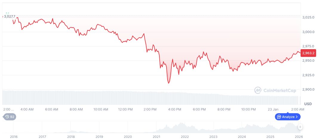 Ethereum (ETH) is currently valued at $2,971.49, with a market cap of $358.64 billion, according to CoinMarketCap data. Its 24-hour trading volume has decreased by 39.14%, alongside a 24-hour price drop of 1.67%. The ETH market continues to navigate volatile conditions.