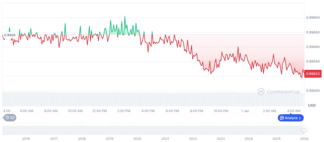 As reported by CoinMarketCap, Tether USDt (USDT) currently stands at a price of $0.99 with a market dominance of 6.31%. The stablecoin experienced slight price decreases of 0.04% over the past 24 hours and 0.10% over 7 days. It holds a market cap of formatNumber(186786741785, 2).