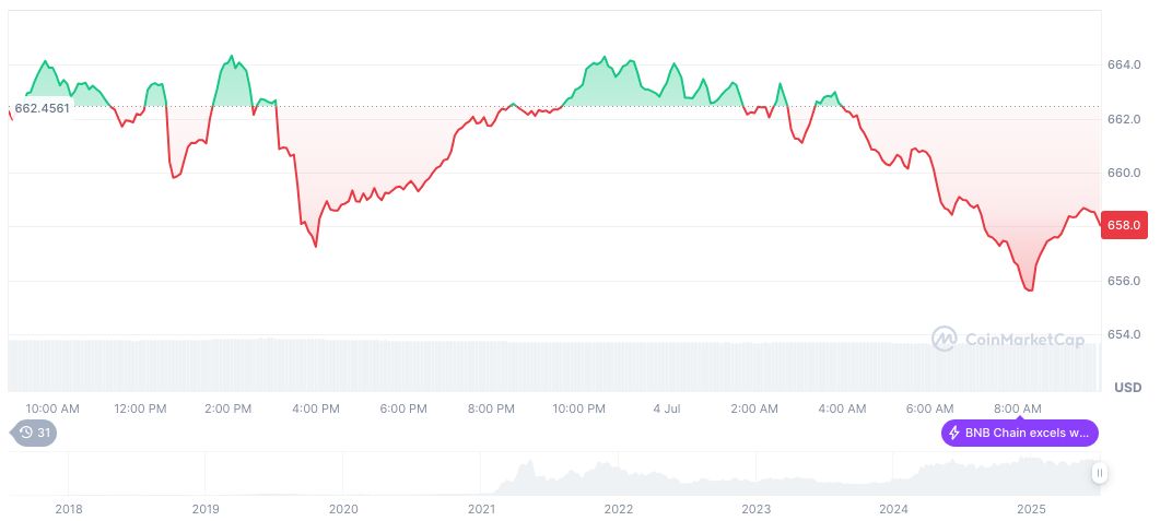 As of the latest CoinMarketCap report, BNB is priced at $658.28. The cryptocurrency’s market cap stands at $92.74 billion with a dominance of 2.76%. Recent trading volume showed a decrease of 6.63%. BNB’s price has seen fluctuations, declining by 0.88% in the past 24 hours but increasing by 10.23% over the last 90 days.