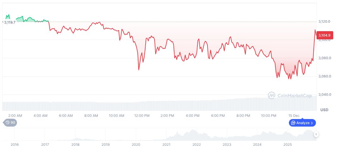 As of the last update via CoinMarketCap, Ethereum (ETH) trades at $3,120.77 with a market cap of $376.66 billion. A 24-hour trading volume of $18.56 billion indicates an increase, despite a 22.32% and 30.86% drop over two and three months, respectively.