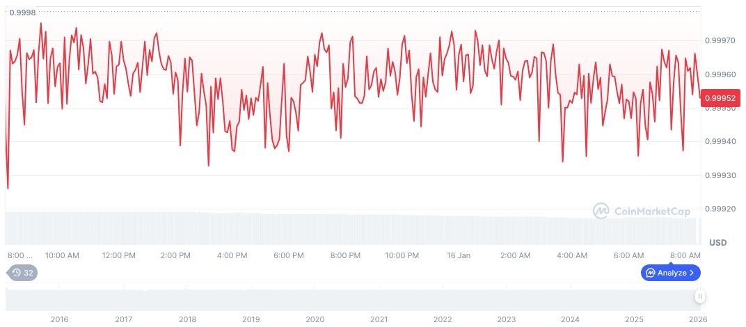 Tether USDt (USDT) maintains its standard $1.00 price with a market cap of 186,773,602,108, reflecting a 5.77% market dominance per CoinMarketCap. Despite a 24-hour trading volume drop by 18.02% to 99,518,542,887, price stability remains with a 0.00% daily change.