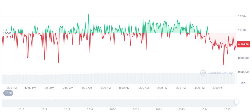 As of May 30, 2025, Tether USDt maintains a stable price of $1.00 with a market cap of formatNumber(153106259510, 2), representing 4.61% market dominance, CoinMarketCap reports. Trading volumes show robust activity at formatNumber(100297330248, 2), despite minor price fluctuations over 90 days.