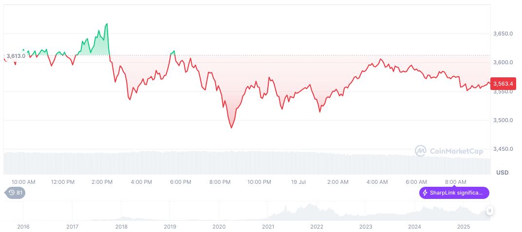 Ethereum (ETH), as of July 19, 2025, holds a market cap of formatNumber(430530363305, 2) with a 24-hour trading volume of formatNumber(41525769838, 2). Data from CoinMarketCap shows Ethereum’s price at $3,566.59, with a notable 90-day gain of 124.37%, despite a short-term 1.35% dip over 24 hours.