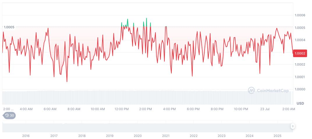 In stablecoin markets, Tether USDt (USDT) remains crucial with a market cap of $162.01 billion and stable price of $1.00. Recent trades totaled $146.70 billion, unaffected by Hong Kong’s regulatory measures. CoinMarketCap reveals negligible short-term price shifts, maintaining market builder status.