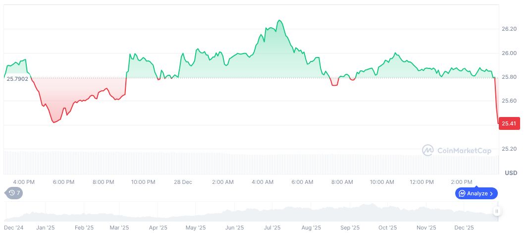 According to CoinMarketCap, Hyperliquid’s HYPE token is currently priced at $25.49 with a market cap of $8.65 billion. Over the past 60 days, the price has decreased by 45.29%. The 24-hour trading volume stands at $99.88 million, a 17.27% drop. Data remain accurate as of December 28, 2025.