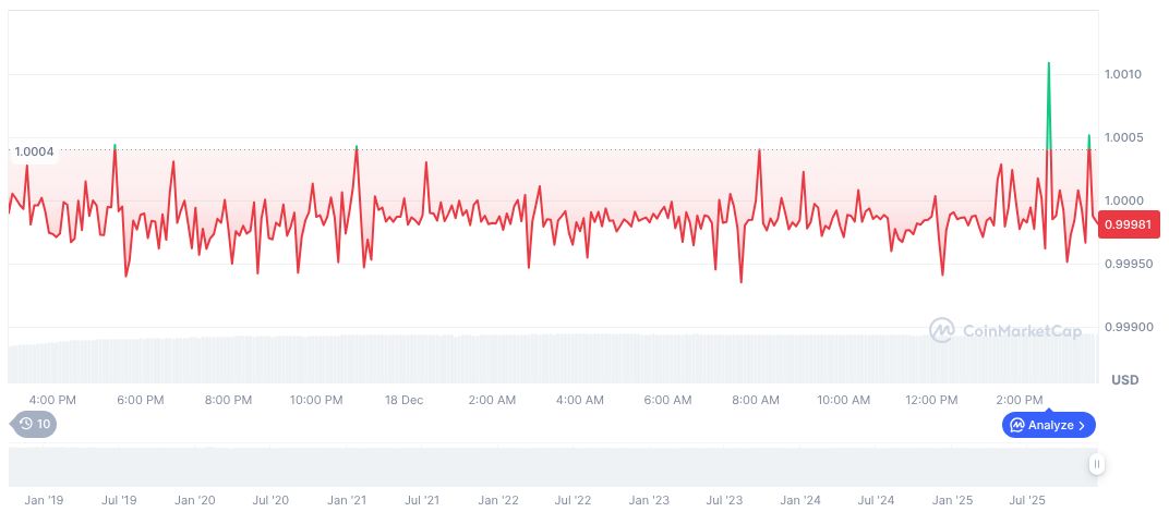 According to CoinMarketCap, USDC’s current trading price remains at $1.00, with a market cap of $77.60 billion and a market dominance of 2.59%. Its 24-hour trading volume shows a substantial activity at $13.14 billion, reflecting a 25.38% change. Price adjustments across various periods show minimal deviations, indicating stability.