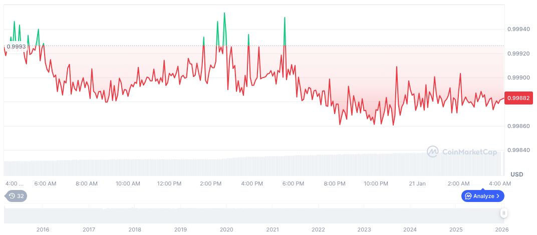 According to CoinMarketCap, Tether USDt (USDT) maintains a steady value of $1.00, with a market cap of $186.91 billion and a daily trading volume of $111.85 billion, reflecting a 2.79% increase over the last 24 hours. Despite controversies, it exhibits stability amid digital financial landscapes.