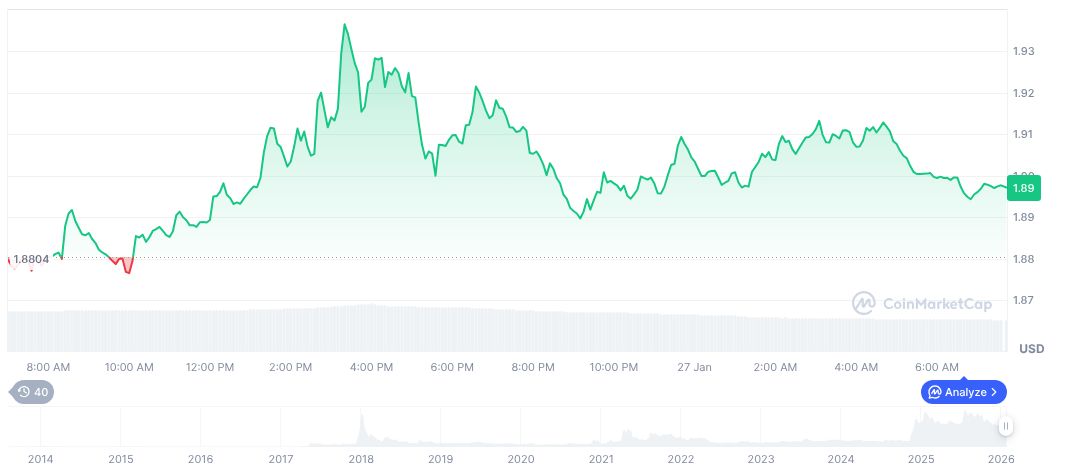 XRP is currently priced at $1.90, maintaining a market cap of $115.47 billion, according to CoinMarketCap. It represents a market dominance of 3.86%. Recent trading volume fell by over 21%. Although the 24-hour price rose 0.97%, the 90-day trend fell sharply by 27.91%.