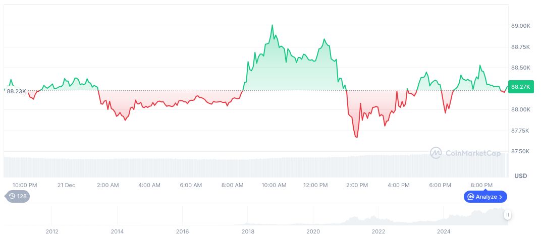 Bitcoin (BTC) shows a market cap of formatNumber(1784797682909.42, 2) USD and maintains a market dominance of 59.15%, as per CoinMarketCap data on December 22, 2025. Its price, currently at $89,393.53, rose by 1.61% over the last 24 hours. Historical price variations include a fall of 20.28% over the last 90 days.