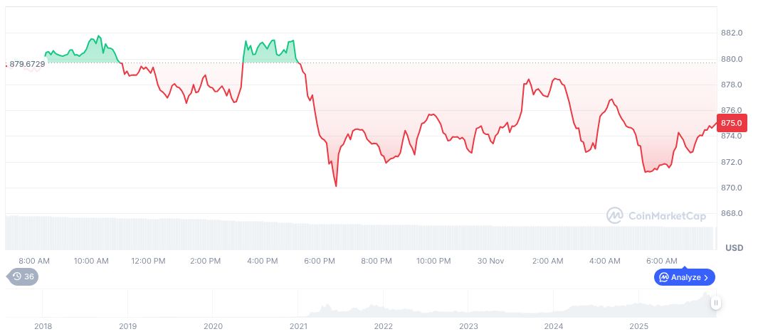 According to CoinMarketCap, BNB’s current price is $875.15, with a market cap of formatNumber(120539862810.01, 2). The token has seen a 0.43% decrease over 24 hours, despite a 4.12% rise over the past week, and shows a 23% trading volume drop.