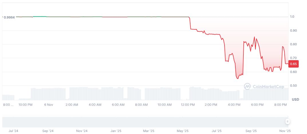 CoinMarketCap data shows Stables Labs’ USDX price plummeted to $0.66, reflecting a 34.22% drop in 24 hours. Despite a $118.82 million fully diluted market cap, the circulating supply remains nonexistent, with a 124.51% spike in trading volume recorded in the same period.