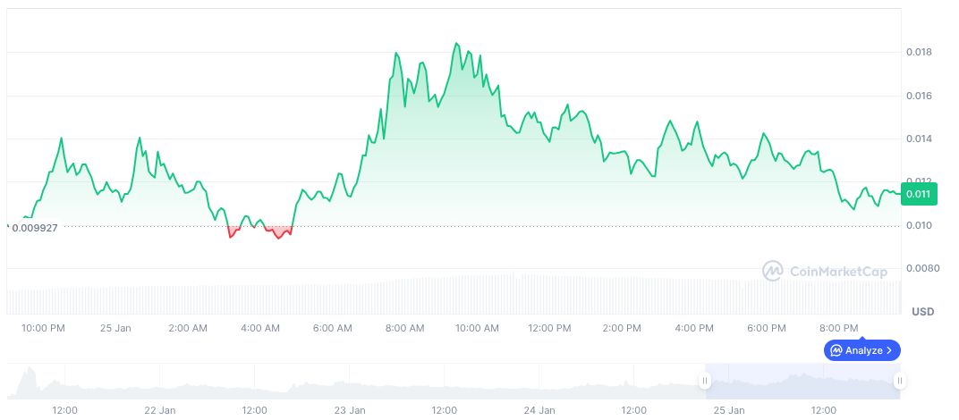 According to CoinMarketCap, the “memes” coin currently trades at $0.01 with a market cap of $11.50 million. The 24-hour trading volume rose by 38.54% to $49.86 million. Price fluctuations showed a sharp increase of 12.15% over 24 hours and a staggering 356.47% over 90 days.