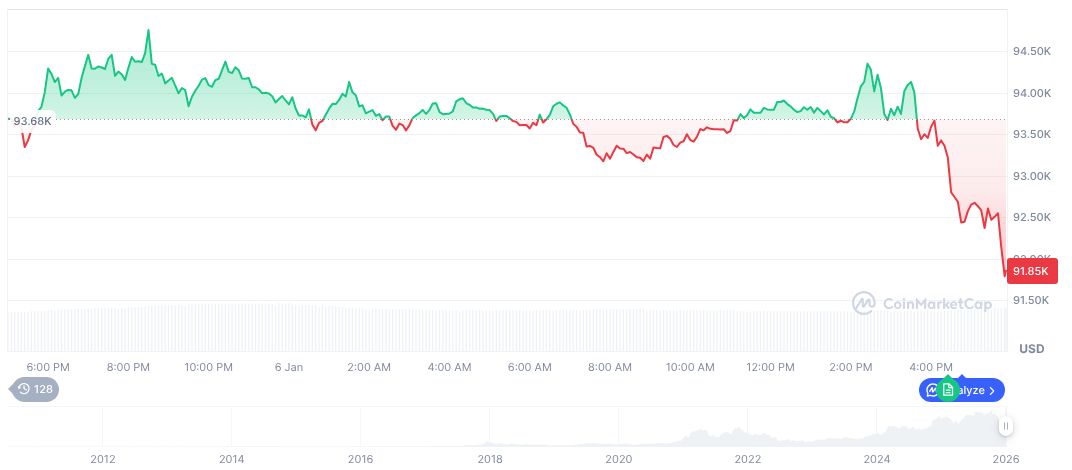 Bitcoin (BTC) trades at $92,107.04. It retains a market cap of $1.84 trillion, dominating 58.13%. Data from CoinMarketCap indicates a 1.83% dip in 24 hours, with a modest 3.62% weekly gain. The circulating supply is 19,972,684 out of a max supply of 21 million.