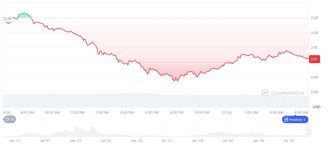 According to CoinMarketCap, the current price of NEAR is $2.11, with a market cap of approximately $2.70 billion. The 24-hour trading volume decreased by 9.24% to $202.32 million. Over the past 24 hours, NEAR’s price has declined by 5.3%. In the last 30 days, the price has fallen by 20.66%.