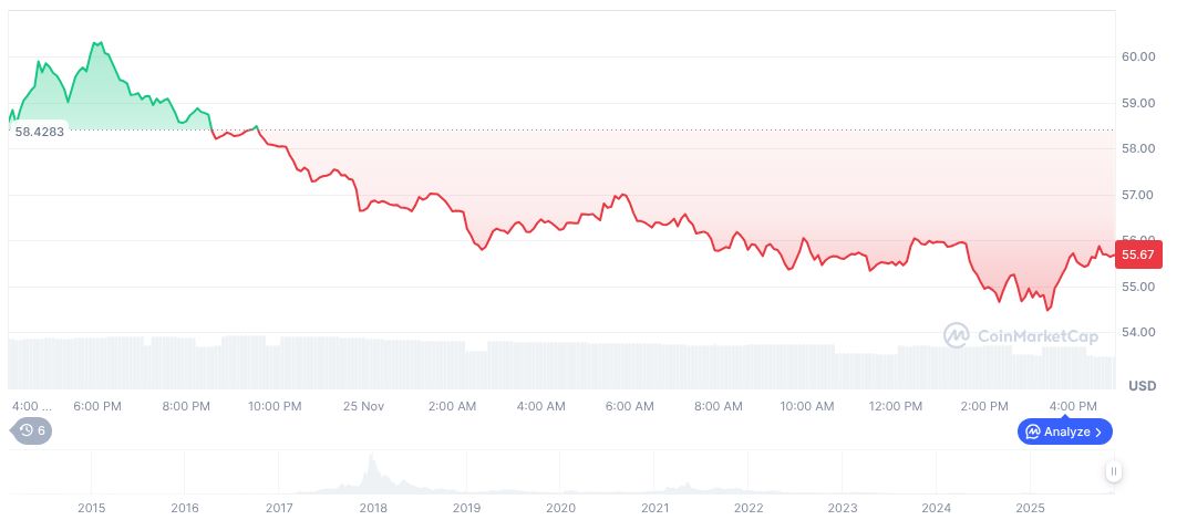 As of November 25, 2025, CoinMarketCap reports Dash’s market data as follows: a current price of $55.66, with a market cap of $695.67 million and a fully diluted cap of $1.05 billion. The 24-hour trading volume stands at $106.48 million, reflecting a -35.96% decrease. Price movements indicate a 90-day increase of 136.29%, signaling investor interest and potential volatility.