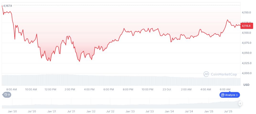 PAX Gold (PAXG), trading at $4,117.25, holds a market cap of $1.36 billion, according to CoinMarketCap. With a circulating supply of 330,979.15, the 24-hour volume saw a decline of 27.01%, impacting its dominance at 0.04%. Recent price changes show a 30-day increase of 9.34%, while experiencing a 0.87% decrease in the last 24 hours.
