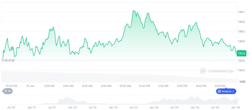 As of January 10, 2026, Solana (SOL) was trading at $135.69 with a market cap of $76,567,375,829.35 billion. Over the past 90 days, the price has decreased by -30.20%, according to CoinMarketCap data. Trading volume was $1,709,528,552.95 billion, reflecting a significant -67.91% change over 24 hours.