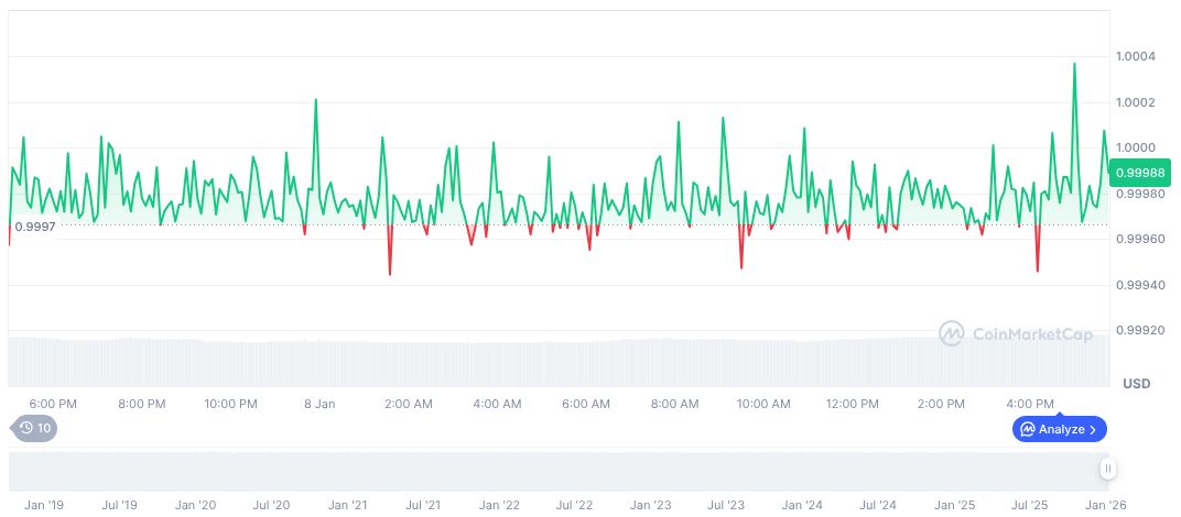 USD Coin (USDC), valued at $1.00, holds a market cap of $74.88 billion with a 24-hour trading volume of $11.82 billion, as per CoinMarketCap. Its market dominance is 2.42%, with the price dipping slightly by 0.04% in 24 hours. Data updated on January 9, 2026.