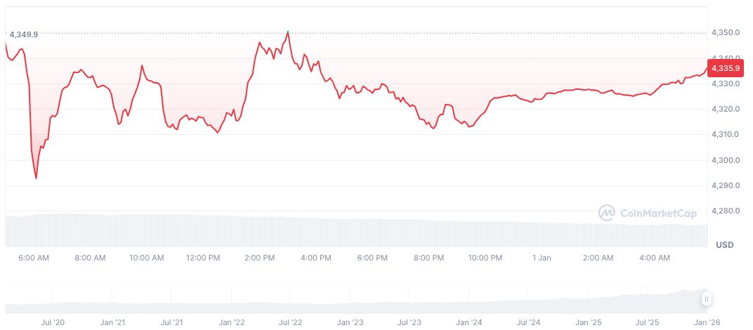 Based on recent CoinMarketCap data, Tether Gold (XAUT) currently trades at $4,335.03 with a market cap of $1.77 billion. Its 24-hour trading volume is valued at $148.26 million, reflecting a decline of 27.45%. The token’s circulating supply stands at 409,217.64 as of the latest update.