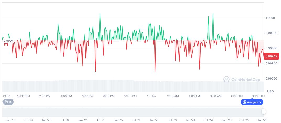 USDC is currently priced at $1.00, with a market cap of $75.66 billion and dominance at 2.31%. Trading volume in the past 24 hours amounts to $19.18 billion, reflecting a 6.17% decrease. Over the past 60 days, the price experienced a gradual decline of 3.59%, reported CoinMarketCap.