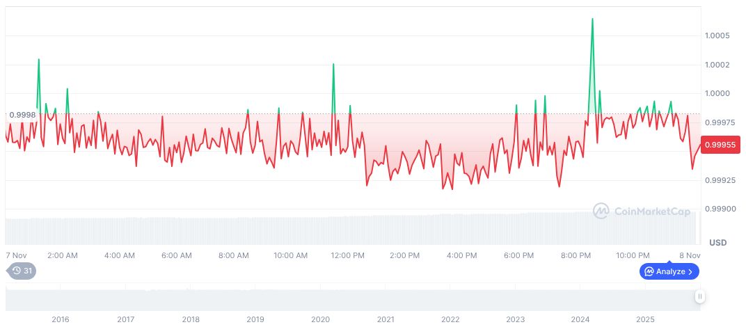Tether USDt currently holds a price of $1.00 as reported by CoinMarketCap. With a market cap of $183.40 billion, Tether’s daily trading volume soared to $169.86 billion. The price has been stable, with minimal fluctuations over the past 90 days, demonstrating its steady market presence.