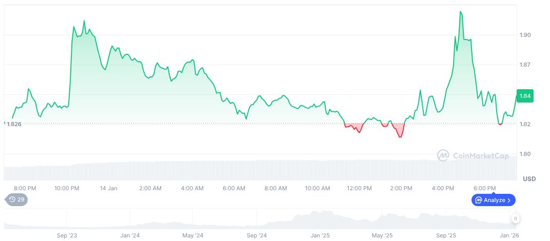 According to CoinMarketCap, Sui’s current price stands at $1.84 with a market cap of $6.97 billion. The 24-hour trading volume surged by 79.10% to $1.38 billion, while the price saw a slight 0.37% increase. Historical price fluctuations include a 27.91% decline over 90 days.