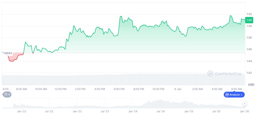 Toncoin (TON) trading at $1.90 holds a market cap of $4.60 billion with a market dominance of 0.14%. It has seen significant changes with a 24-hour trading volume of $136.54 million, experiencing a 3.18% increase in the last 24 hours as reported by CoinMarketCap.