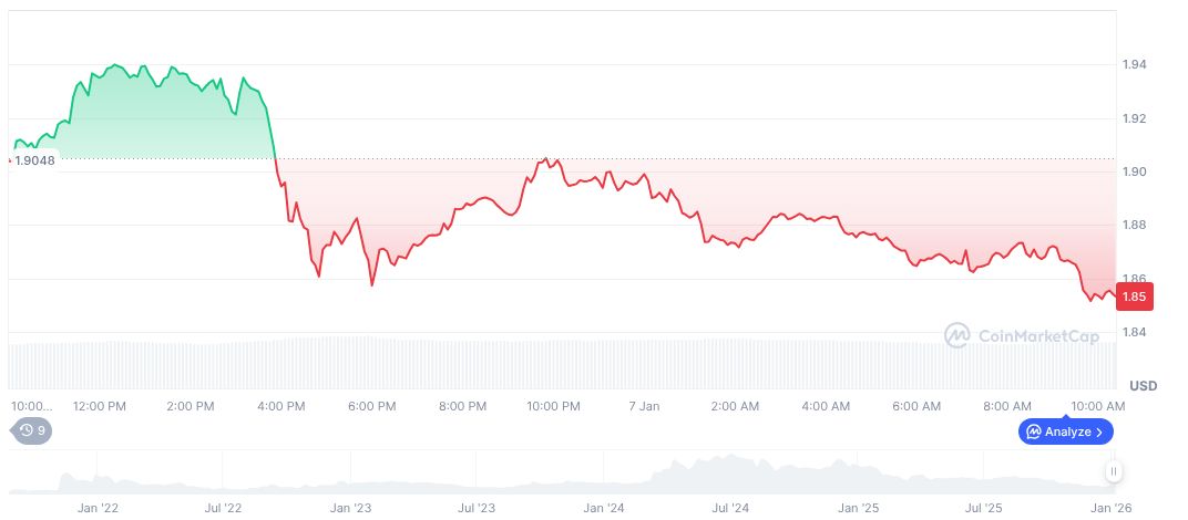 According to CoinMarketCap, Toncoin (TON) currently trades at $1.85, with a market cap of $4.48 billion. The token holds a market dominance of 0.14%, with significant 24-hour trading volumes totaling $138.29 million. Notably, TON has faced a 2.99% decline over the past 24 hours, despite experiencing a 13.36% increase over the last week.